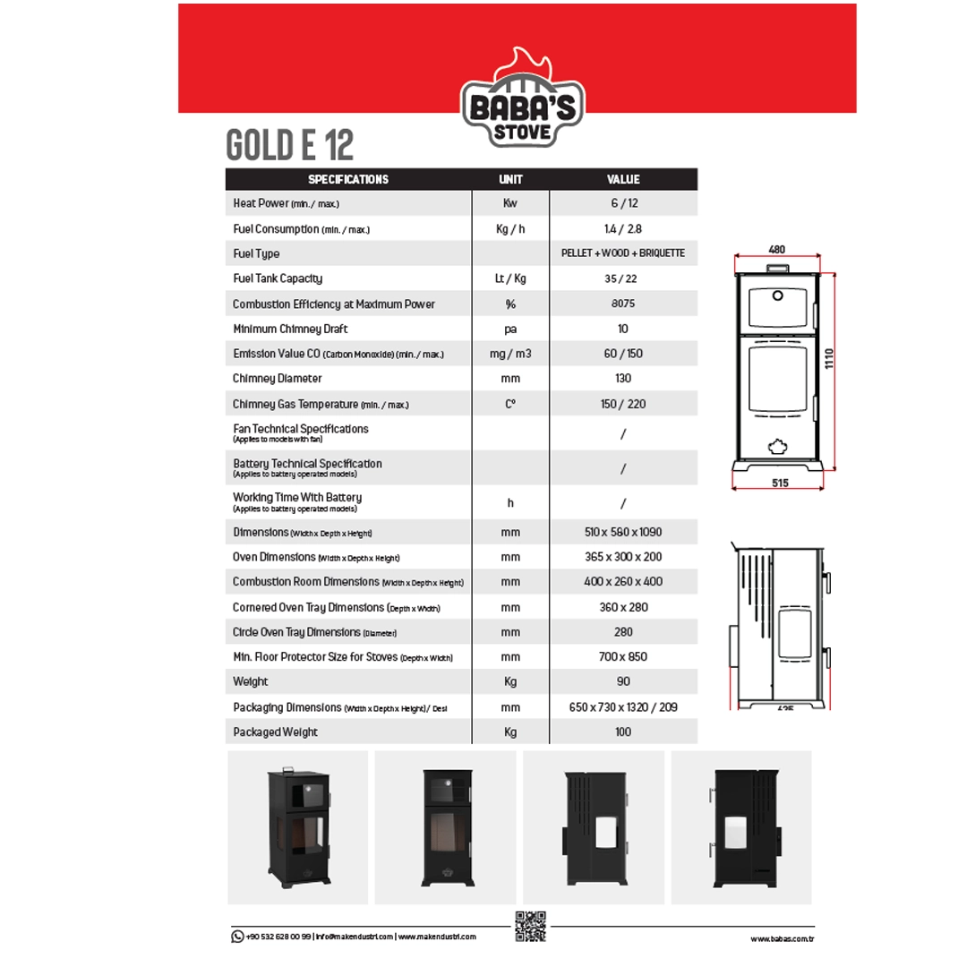 Gold E 12; pelet, odun ve briket odunu yakabilen otomatik çalışan fırınlı bir sobalardır. (6 mm çapında A1 kalite Çam Peleti yakmaya uygundur.) ·
